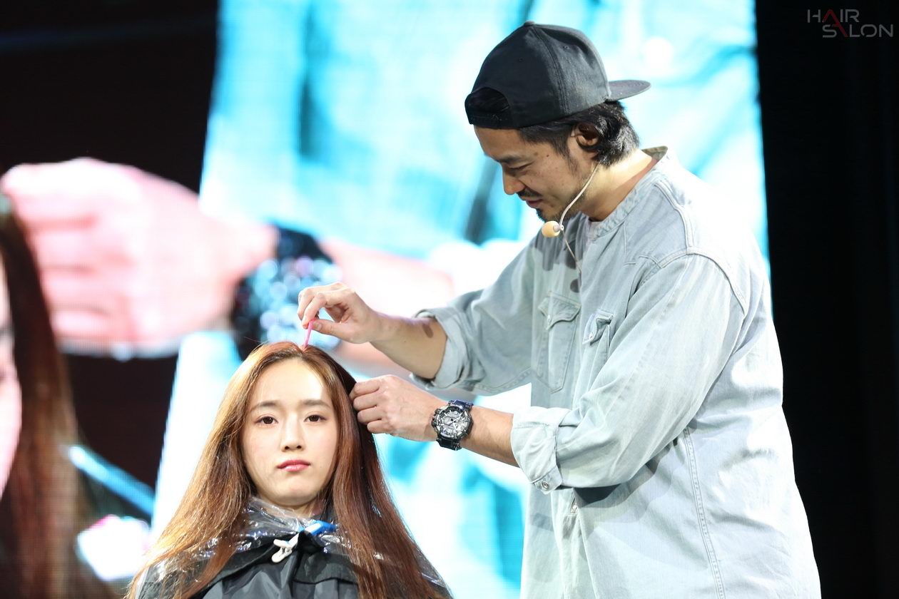 長崎老師示範的第一款造型是在沒有白髮的麻豆頭髮做四片挑染,對於年輕消費者的挑染,設計師習慣以流行染處理,但長崎老師確在這款麻豆以白髮染處理,因為流行染明度太高會讓髮色看起來太亮,而高明度的白髮染則可呈現飽和亮麗色澤,顛覆傳統挑染方式。另外在挑染髮色的選擇是以麻豆瞳孔顏色為主,這會讓麻豆五官與長相更能與四片挑染之髮色完美搭配顯現出魅力。