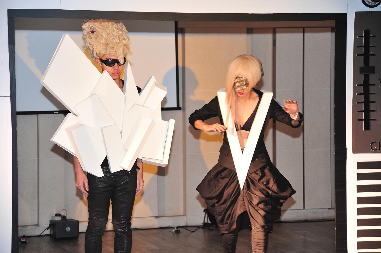 男生:正面也是以單一顏色(白金色)用片片不規則的方式推疊出多角往上延伸的立體型態,而側面則是利用二種大小色塊(紅色,黑色)至於整個體積的正中間來製造視覺上聚焦來加強立體色塊的效果