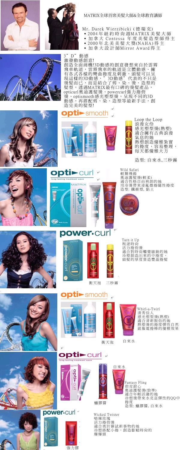 來自美國銷售第一的專業美髮品牌MATRIX,瞭解市場趨勢與需求,擁有最完整的教育訓練及最有口碑的燙、染、洗護、造型產品。台灣萊雅專業沙龍美髮事業部旗下品牌之一MATRIX,特別邀請全球首席美髮大師且是全球教育講師的Mr. Darek Wierzibicki (德瑞克)於2006年9月25日至9月28日來台,於台北及台中兩地舉行3”D”動感研習會,與台灣的專業美髮設計師共同分享亞洲最流行的剪、染、燙及髮型趨勢!此次研習會Darek除會現場示範及講解外,同時會邀請設計師們一起來動手做髮型,並由他現場指導,一起感受3D動感魅力。
