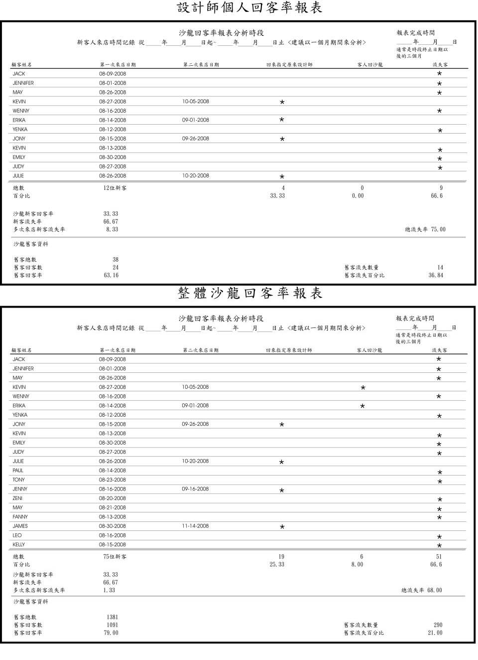 第一個表格計算的是全店的回客率,第二個表格計算的是設計師個人的回客率,因為全店的回客率表現及個人的回客率表現都有評估的必要。