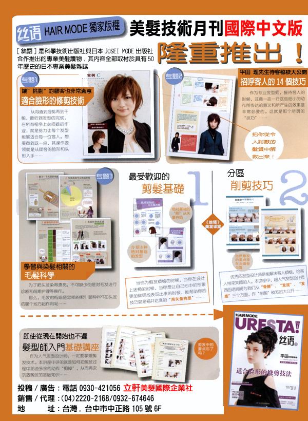 日本女性時尚出版社在日本美髮界享有很高的聲譽,出版了上百種美髮專業圖書,其中以月刊雜誌《HAIR MODE》和《HAIR MODE URESTA!》是主打産品,到明年已有50年的歷史。其中各欄目的作者均爲日本美髮界有很大聲望的美髮大師。
