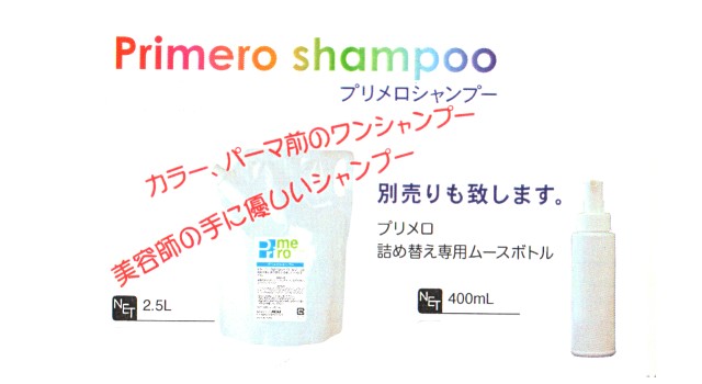 Primero深層洗髮精是使用在〝護〞〝染〞〝燙〞之前的專業洗髮精,百分之百在日本製造、生產、包裝,原裝進口至台灣,雖然採用高品質的配方,2500cc包裝之產品,價格只要1980元,歡迎美髮沙龍同業們來電索取樣品試用。