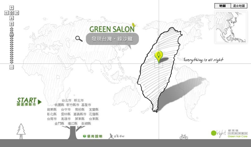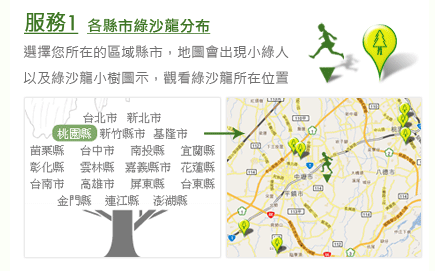 <1> 請先選擇您所在的縣市~地圖會出現小綠人以及綠沙龍店家小樹圖示~