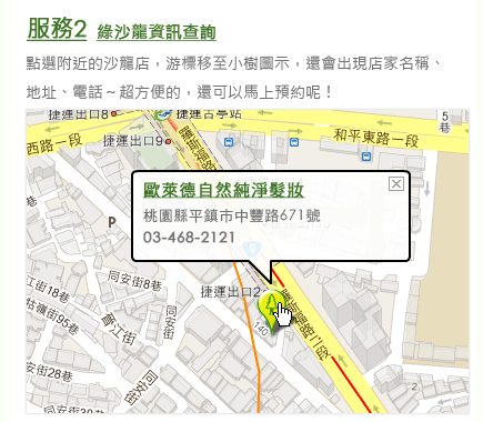 歐萊德O’right推出首創互動服務《發現台灣.綠沙龍》,以最「人性化、便利性、直覺性」的方式找到「綠沙龍足跡」,只要動動手指,就可知道你所在地附近有哪些美髮沙龍店家,秉持為環保努力的理念,提供消費者選擇更健康的綠色服務。從你家到綠沙龍,就是這麼容易!