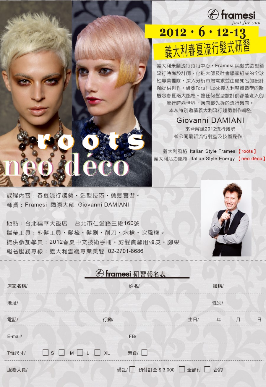 義大利米蘭流行時尚中心,Framesi與髮式造型師流行時尚設計師、化妝大師及社會學家組成的全球性專業團隊,深入分析市場需求並由最知名的設計師提供創作,研發Total Look義大利整體造型的新概念春夏兩大風格。讓任何髮型設計師都能進入的流行時尚世界,邁向最先鋒的流行趨向。