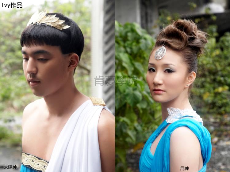 Ivy:以希臘神話之《月神》、《太陽神》為今天畢典成果展主題,在月神造型上以盤髮加指推波浪技巧,表現出皎潔氣質;而太陽神的造型則是以簡單俐落的剪髮突顯太陽神的正直。Ivy是一位當了20年的護士,為了做自己喜歡的工作,毅然決然轉換跑道,也獲得先生與現讀大學、國中的孩子支持。在今天畢典上妹妹與口才辯給40年鄰居好友祝福下,更飆淚不已。Ivy期待爾後能到部落為原住民小朋友義剪並教導小朋友剪髮技術,學到一技之長。....更多Ivy介紹...