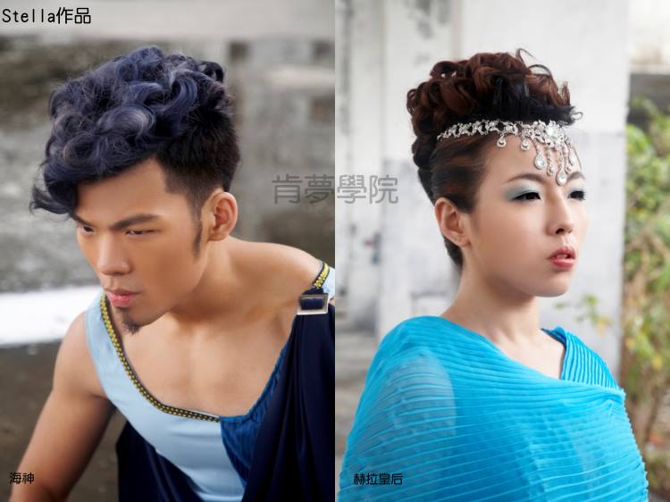 Stella:以希臘神話之《海神》、《天后》為今天畢典成果展主題,在海神染髮上,先漂白後染成藍色及灰色來呈現大海的視覺效果,並以推剪方式剪出剛硬髮型,呈現海神之堅毅性格;天后則是盤上電棒燙捲後的假髮,展現其氣勢。Stella要到肯夢學院上課時,剛開始時家人不盡贊成,但經過一段學習時間後,爸爸、媽媽和姐姐都變成她的模特兒與粉絲,更讓Stella高興飆淚的是今天爸媽都出席畢典。爸爸以台語敦厚感性致詞感謝朱平先生與講師團隊教導其女兒一技之長,並盼望爾後Stella在職涯中能回到肯夢與講師切磋技能,獲得全體貴賓大大掌聲,朱平先生與講師、工作人員滿滿答應爸爸之期許與對女兒之愛護。....更多Stella介紹..