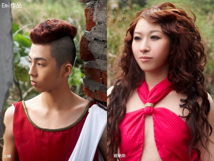 Emi:以希臘神話之《火神》、《愛神》為今天畢典成果展主題,在火神的造型上利用電棒與紅橘挑染表現出火焰般強烈的造型;而愛神則以電棒捲出大波浪髮型表現其浪漫唯美。Emi本身愛做瑜珈,喜歡身心靈平衡的感覺,認同AVEDA強調身心平衡的文化與朱平先生的理念。外婆、阿姨和來自雲林布袋戲故鄉的乾爹一家人,參加了今天的畢典,在擁有台灣布袋戲始祖血統的乾爹與乾弟流利口才下,更顯現今天畢典的風采。....更多Emi介紹...