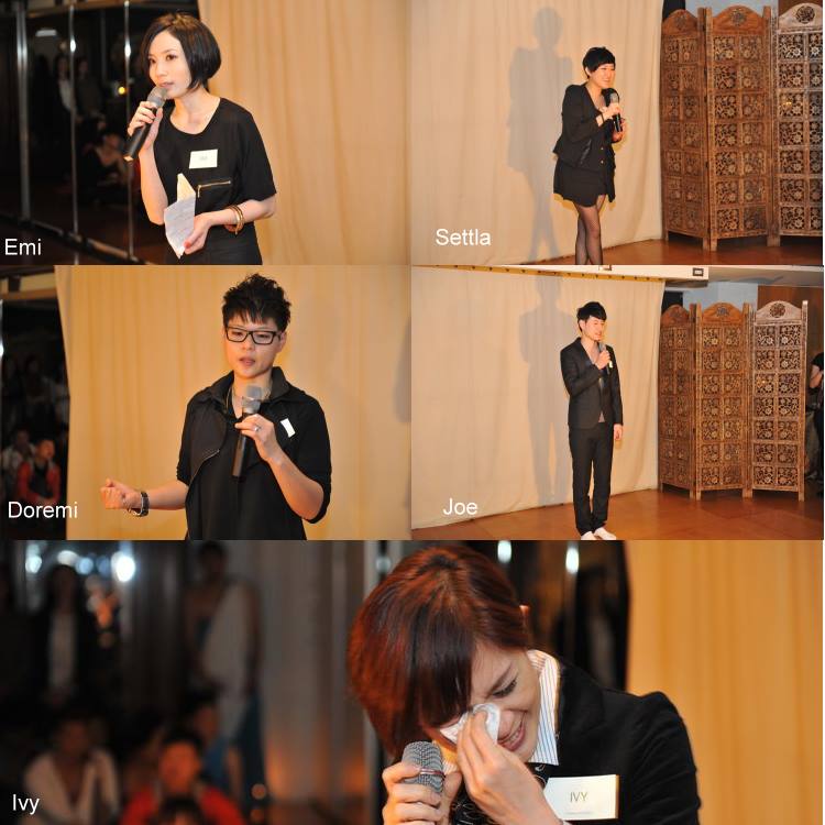 緊接著下來是今天的重頭戲,畢業生成果發表,依序由Ivy、Emi、Settla、Doremi、Joe五位畢業生在現場以投影片講解他們作品的發想、主題概念、設計構思、元素等等。十個月之前對美髮什麼都不會什麼都不懂,在今天居然能呈現完美作品且能對其作品之創造原由侃侃而談,若以傳統沙龍職涯能達到此境界至少要花三、五年工,即使能達到此技術,但能在眾人面前闡述作品理念表現出設計師個人魅力與台風則是傳統沙龍環境是無法做到的。在Henry帶領的技術講師團隊與肯夢生活禮儀、經營管理、市場行銷、財務規劃、企劃‧‧等等講師團隊教導下,在今天上台分享這十個月與五位同學種種的學習生涯甘與苦,講到歡愉時滿場大笑,講到要分離之不拾時淚水不自主滴落在台上台下師與生之臉頰。隨即由肯夢學院技術團隊負責人Henry公佈這屆畢業生得獎名單,分別是;悅日人獎:Doremi、敬學獎:Settla、銷售獎:Emi與Ivy、第一名:Joe。並由朱平先生一一為這些獎項與得獎者頒獎。朱先生在頒獎時等別感謝對這一次參與畢典的模特兒:台藝大、輔大、台大學生付出,沒有這一群Model或學生則畢業生將無法達到他們學習過程的支柱與畢典成果品。