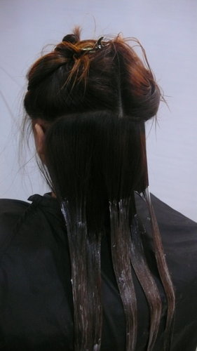 4.塗抹1劑時,先將髮片梳順再均勻塗抹就好…不要一直梳…一直梳…一直梳…梳到頭髮都倒彈了還再梳~~這樣並不會比較均勻啦!