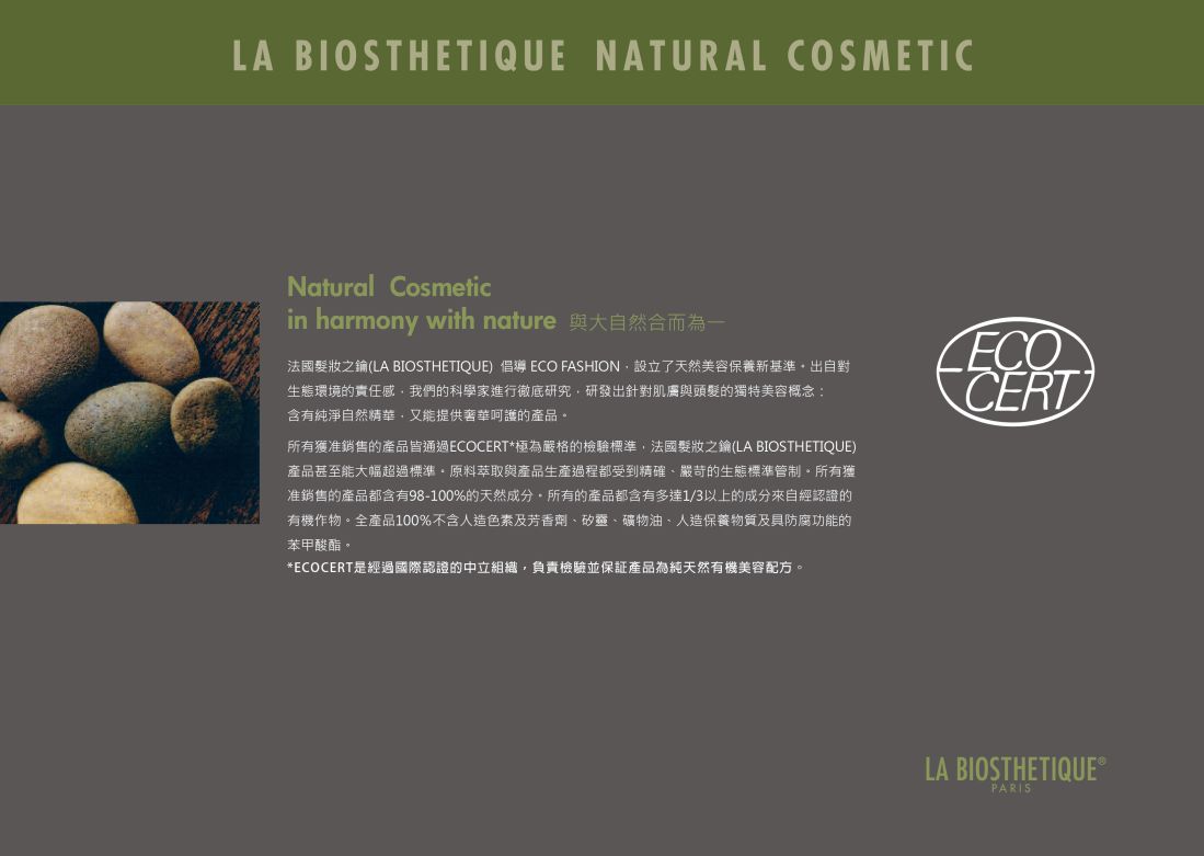 - 所有獲准銷售的產品皆通過ECOCERT極為嚴格的檢驗標準,法國髮妝之鑰(LA BIOSTHETIQUE)產品甚至能大幅超過標準。