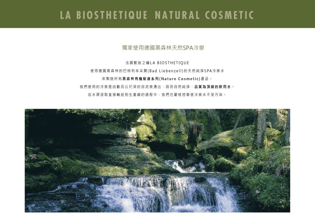 法國髮妝之鑰LA BIOSTHETIQUE使用德國黑森林的巴特利本采爾(Bad Liebenzell)的天然純淨SPA冷泉水來製造所有黑森林有機髮膚系列(Nature Cosmetic)產品。