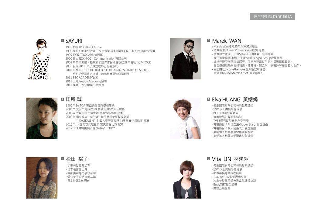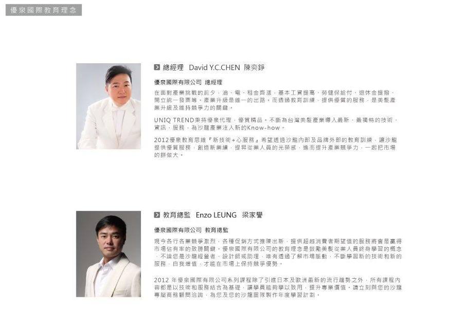 - 經營理念: 建立優質新服務的專家! 為台灣專業美髮產業導入新觀念, 新趨勢與新技術. 協助沙龍建立優質新服務與沙龍品牌形象, 提昇服務口碑,創造新業績!