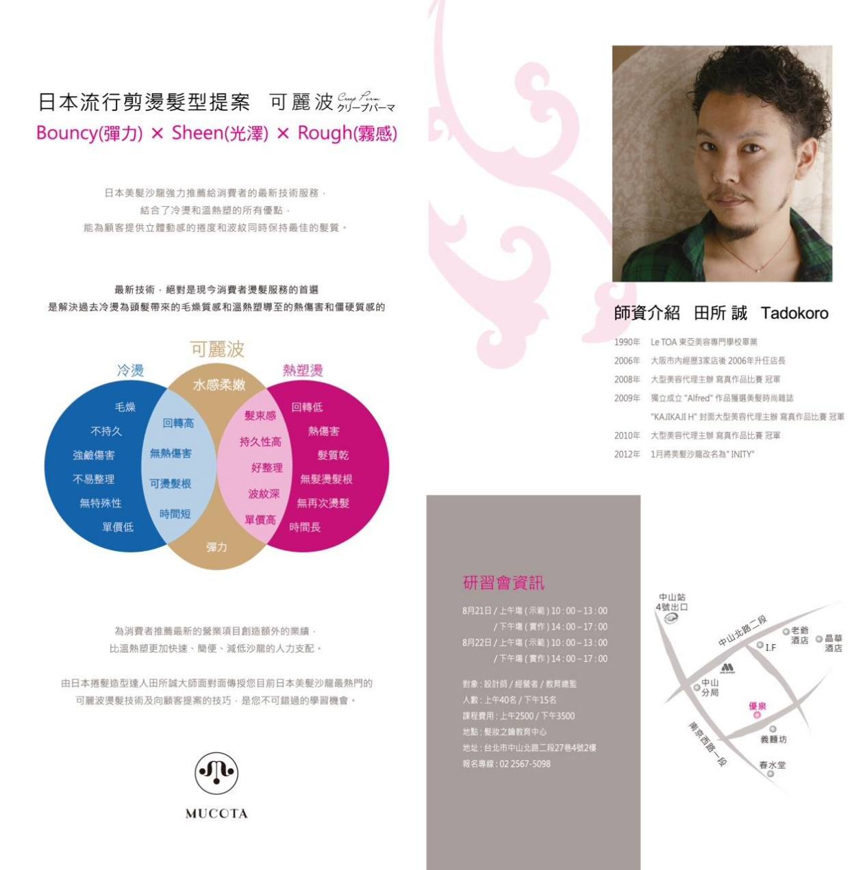 由日本捲髮造型達人田所誠大師面對面傳授您目前日本美髮沙龍最熱門的可麗波燙髮技術及向顧客提案的技巧,是您不可錯過的學習機會。