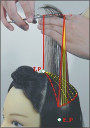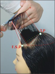 3.定點放射式引導髮片:使裁剪後的頭髮由定點如『傘狀平均散落』的效果。