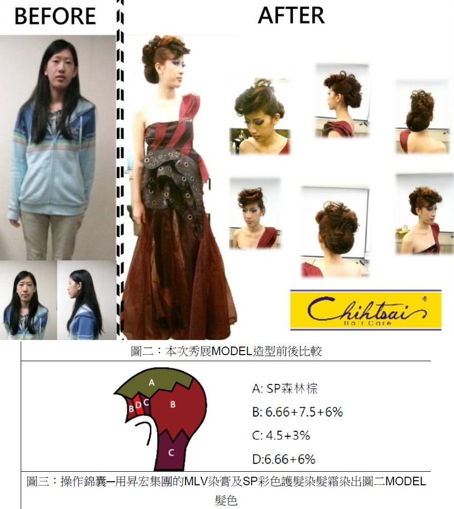 美國標榜美髮學院台灣分院團隊,在這次秀展中選擇芝彩的造型噴霧、昇宏集團的MLV染膏及SP彩色護髮染髮霜,運用科學結構式技法,設計了四款具有多層次衝突美感的女士長髮梳編造型,結合「藝術」、「技術」、「創意」,每款作品360度都能呈現出不同風情。ZOE表示,越是大膽、戲劇性的作品,越要注重造型時的每個細節,特別是造型品的挑選與使用,選用芝彩的造型品,令她在塑型及定型時如虎添翼,並能呈現出頭髮最棒的質感。