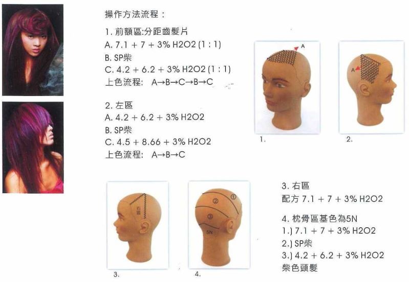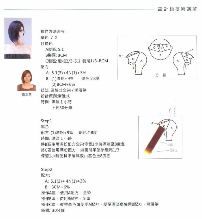 四大分區→0.2cm後斜分髮線→使用漂粉+9%→每片髮片以染髮紙雙包式隔開→停留1.5H