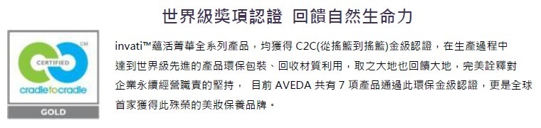 全新包裝加大容量版的invati™蘊活菁華系列不只是在價格方面更具經濟效益,其中更蘊含了資源再利用的環保概念,凡購買「invati™蘊活菁華系列」全新包裝加大容量版1瓶即等於購買原本5瓶200ml的包裝,有效減少40%的塑料,達到”Save money ,save plastic”的環保理念,而大容量新包裝的瓶身使用 100%的回收HDPE塑膠瓶(高密度聚乙烯),invati™蘊活菁華全 系列也因此榮獲象徵包裝界奧斯卡獎的2013 Ameristar Award! AVEDA期許在生產過程中,能同時回饋大自然,讓自然界的力量能夠生生不息美麗循環。