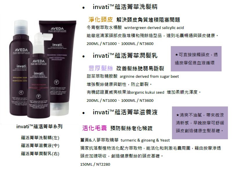 ※invati™ (in-vah’-tee)來自梵文,富有”活絡、鼓舞”的意涵。從現在開始,邀請您親自感受invati™蘊活髮絲無窮生命力,找回自信再現豐盈秀髮迷人風采 !