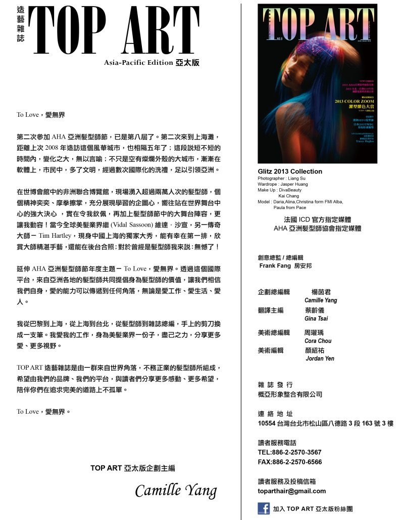 TOP ART造藝雜誌是由一群來自世界角落,不務正業的髮型師所組成,希望由我們的品牌、我們的平台,與讀者們分享更多感動、更多希望,陪伴你們在追求完美的道路上不孤單。