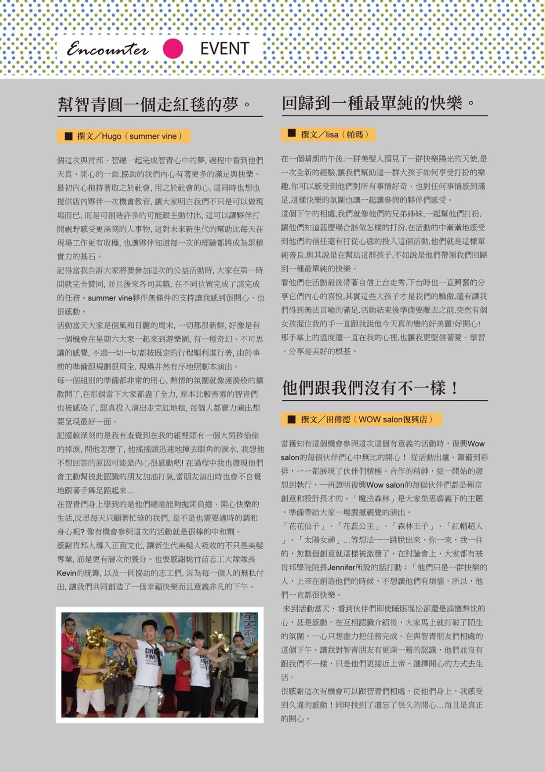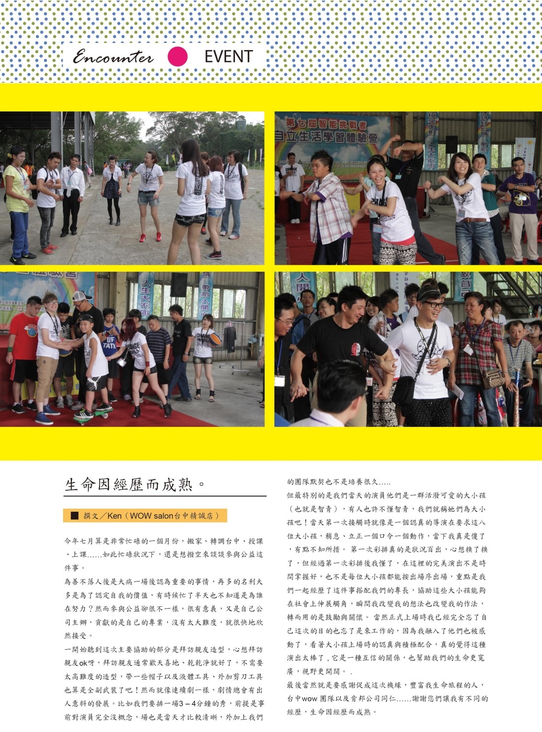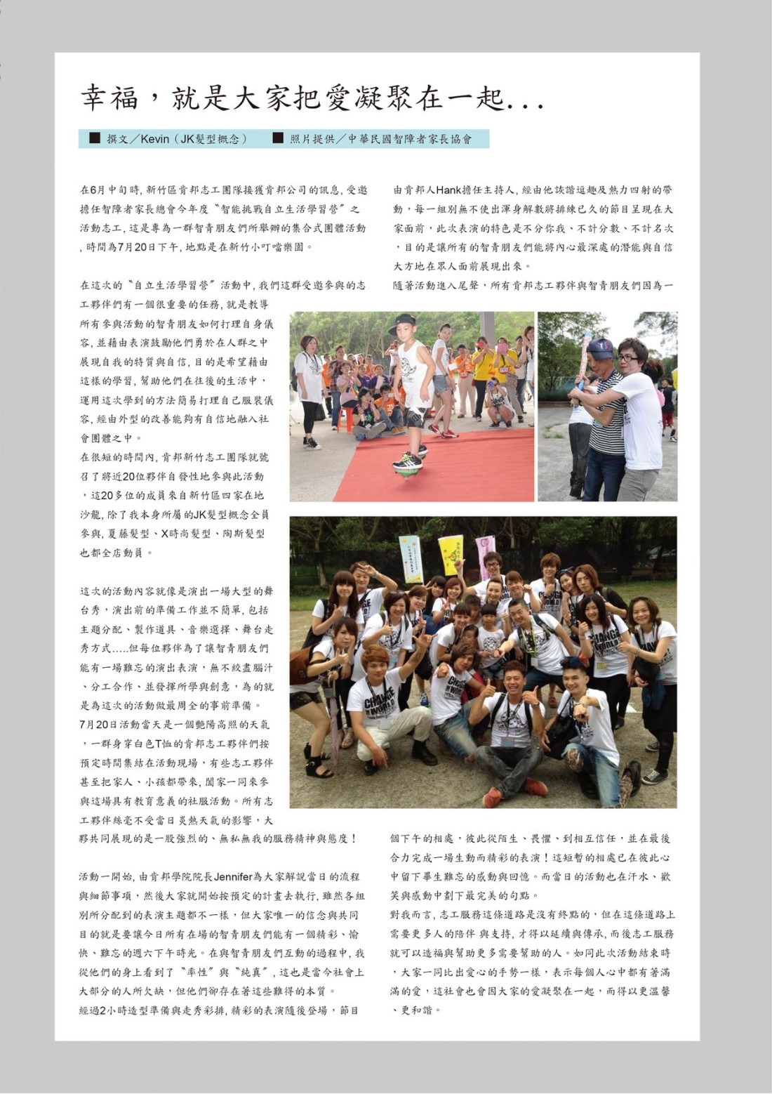 透過中華民國智障者家長協會的安排,肯邦志工團隊有機會在該協會所舉辦的〝智障者自立生活學習營〞中擔任協助與教導的角色,指導一群智能障礙青年簡單打理儀容並視不同場合作出得體裝扮。對所有參與的志工來說,這一次的服務經驗無疑非常的特別。不同於一般的義剪活動,在與智青們互動的過程中,志工們也有諸多的學習跟體會,諸如觀察到智青們往往單純、真誠,這是多數正常人沒有的特質,還有他們容易滿足、真正開心,這也是一般人所匱乏的。