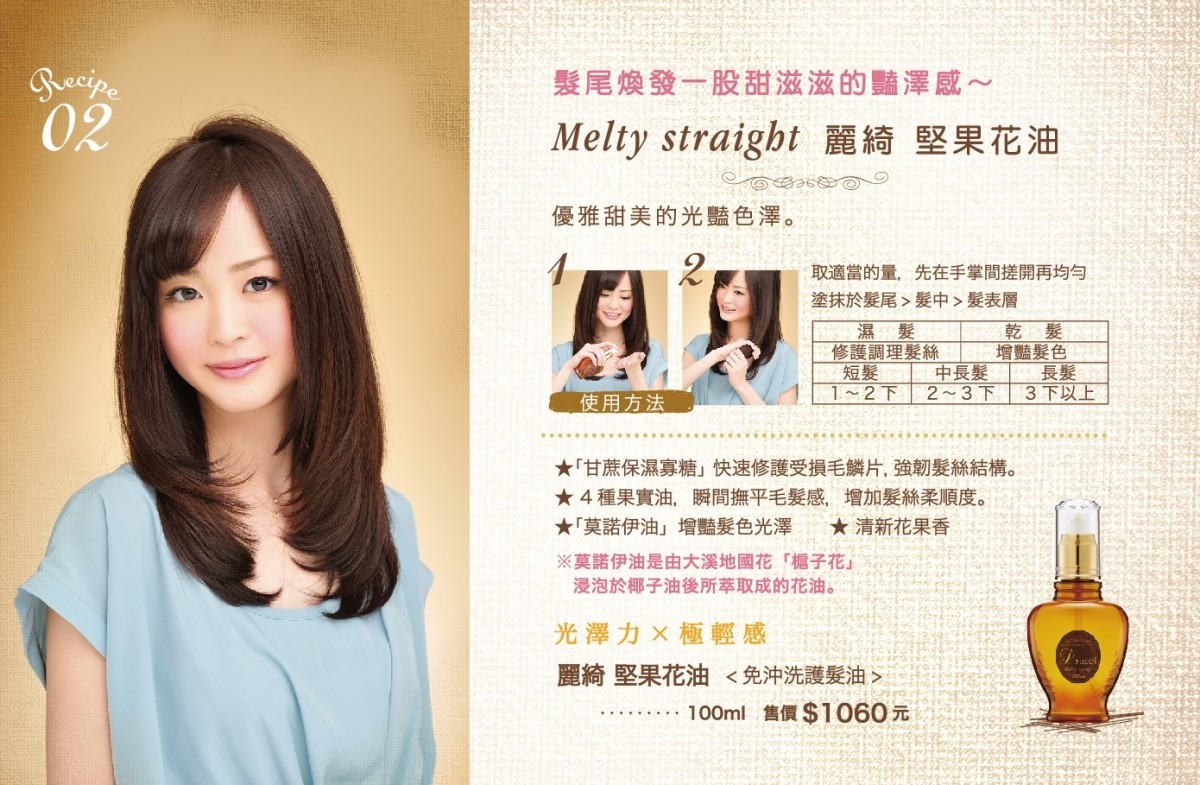 麗綺堅果花油 (免沖洗護髮油)優雅甜美的光豔色澤