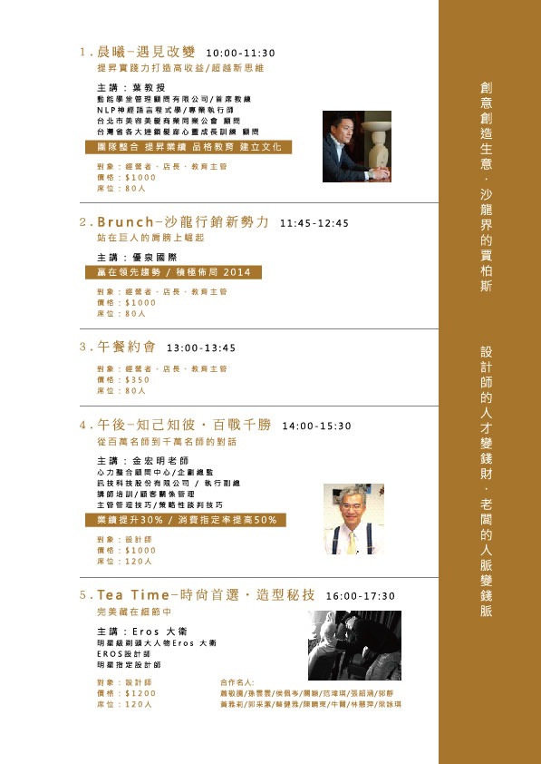 - 經營理念: 建立優質新服務的專家! 為台灣專業美髮產業導入新觀念, 新趨勢與新技術. 協助沙龍建立優質新服務與沙龍品牌形象, 提昇服務口碑,創造新業績!