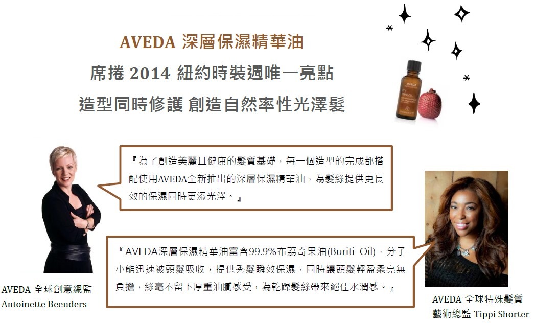 AVEDA深層保濕精華油,富含99.9%天然萃取的布荔奇果油(Buriti Oil) , 讓秀髮立即提升保濕度達41%,瞬間感受柔滑亮澤質感,同時也讓髮絲輕盈不厚重;針對秀場上的各種髮質與造型,AVEDA深層保濕精華油能迅速讓髮絲頭髮柔軟且具有光澤質感,完美呈現不同品牌各種造型,同時兼具時尚感亦不傷害髮質,成為2014 FALL/WINTER紐約時裝週AVEDA造型師指定產品。