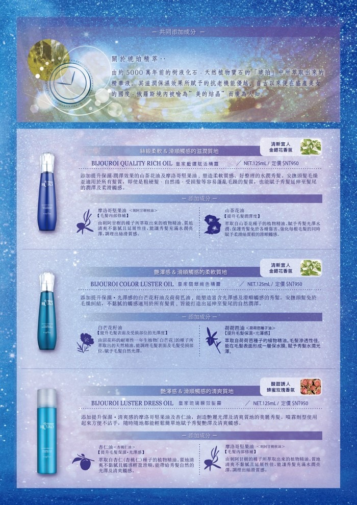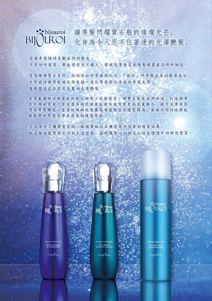 皇家璀璨寶石系列,共同特別添加珍貴植物化石-『琥珀』所萃取出來的精華成分,天然琥珀精萃能補充因受損・老化等原因而消逝的秀髮光澤,重新塑造出自然且美麗的光澤艷髮。不管任何髮質都能變得光可鑑人、實現亮澤髮質的護髮精露,終於誕生~!!