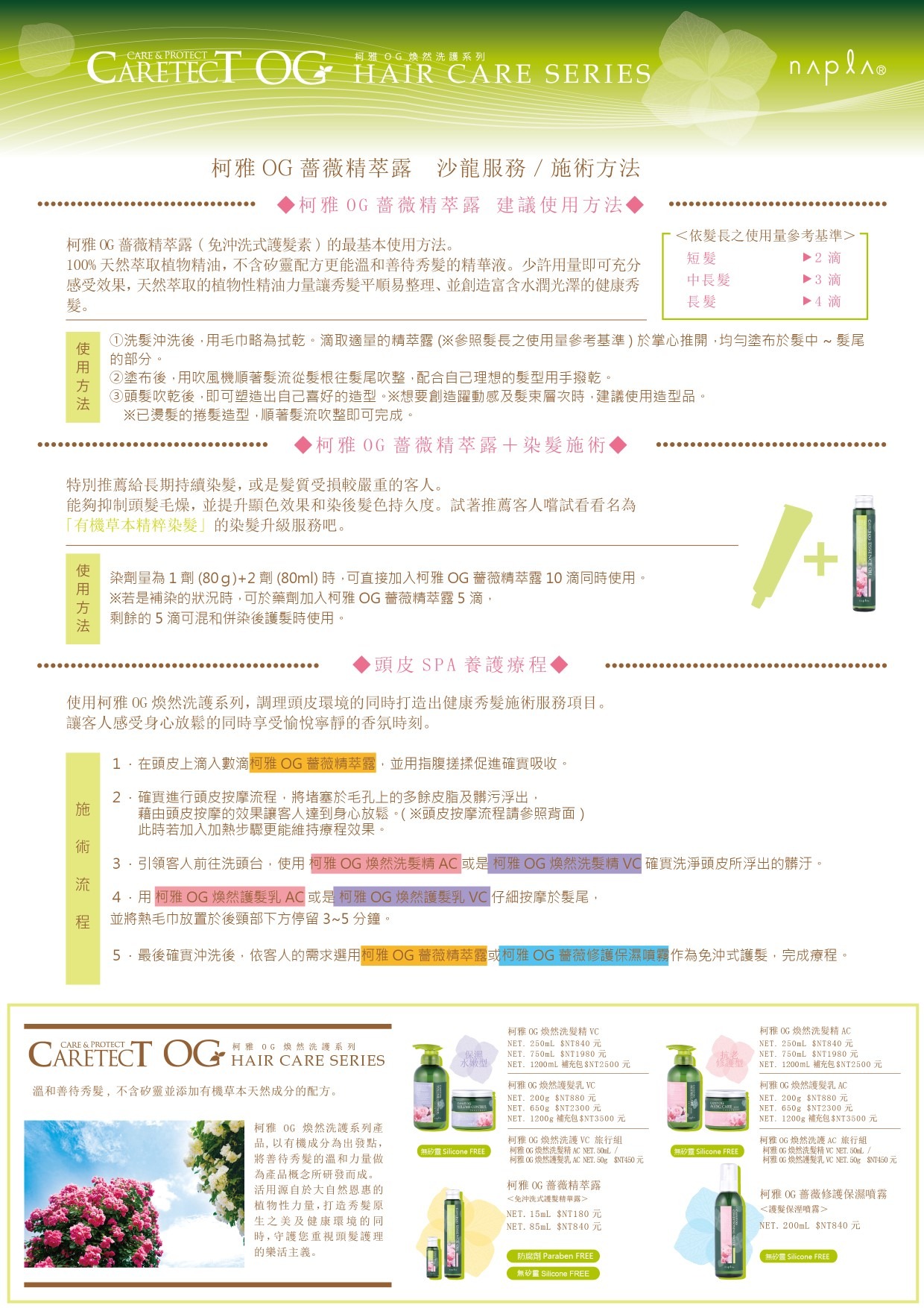 使用柯雅OG煥然洗護系列,調理頭皮環境的同時打造出健康秀髮施術服務項目。