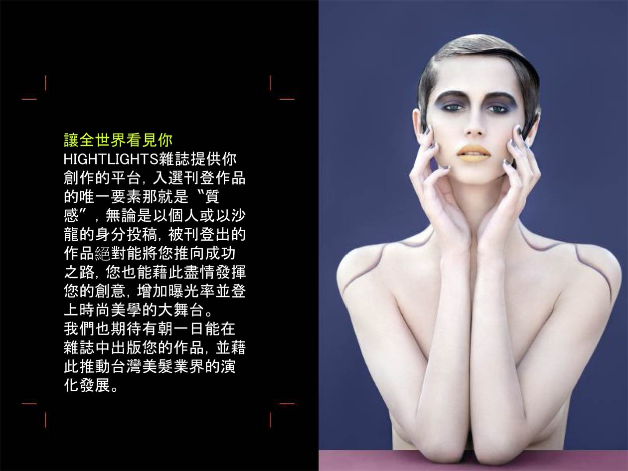讓全世界看見你HIGH LIGHTS雜誌提供你創作的平台,入選刊登作品的唯一要素那就是〝質感〞,無論是以個人或以沙龍的身分投稿,被刊登出的作品絕對能將您推向成功之路,您也能藉此盡情發揮您的創意,增加曝光率並登上時尚美學的大舞台。