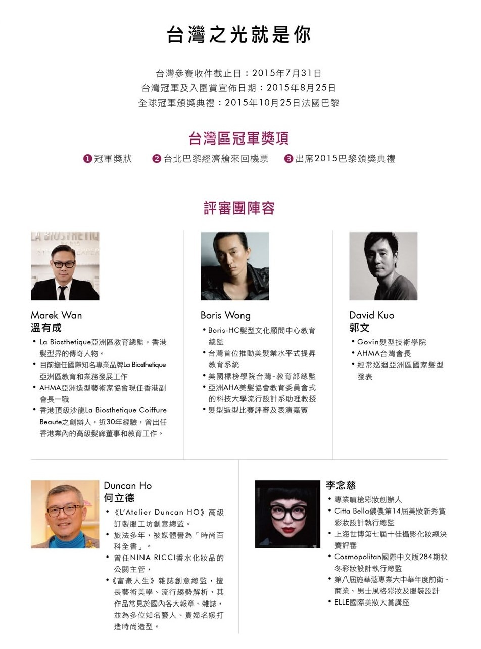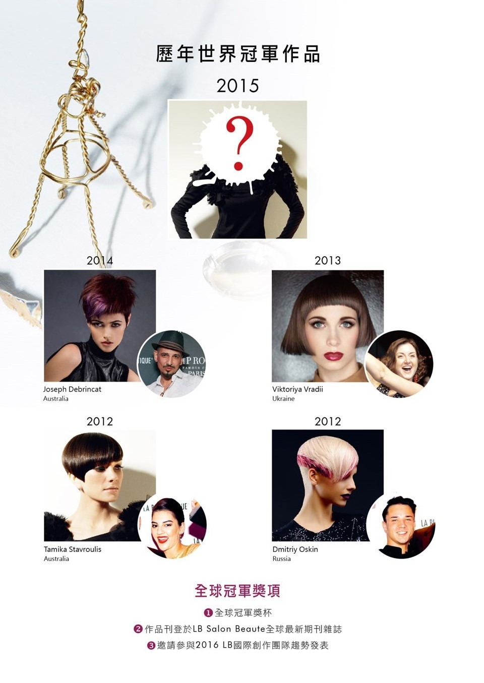 不分國籍不分資歷,更不分年紀,只需要您的作品照片。就可在國際上嶄露頭角,完全契合的打造整體造型:從彩妝、髮型、剪裁、髮色、服裝...等,將那整體的風格與創作拍下,就可參加國際初選。現在準備跨出台灣吧,今年10月,您就是站在法國總決賽舞台上的台灣之光。