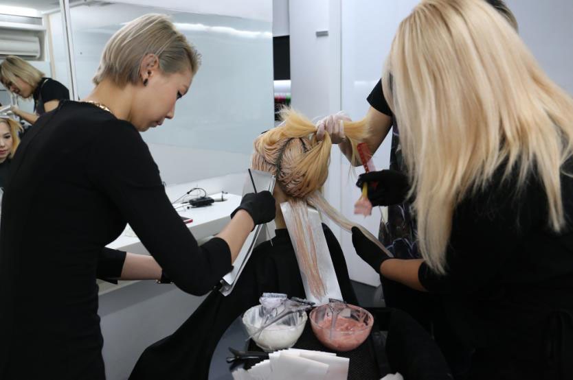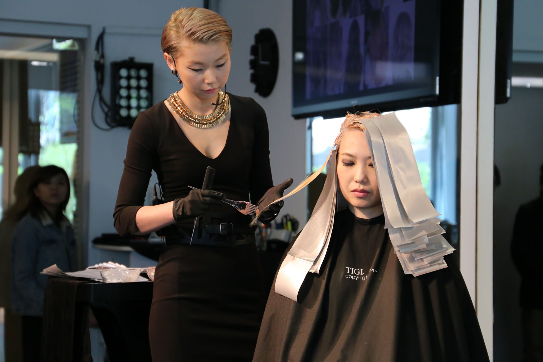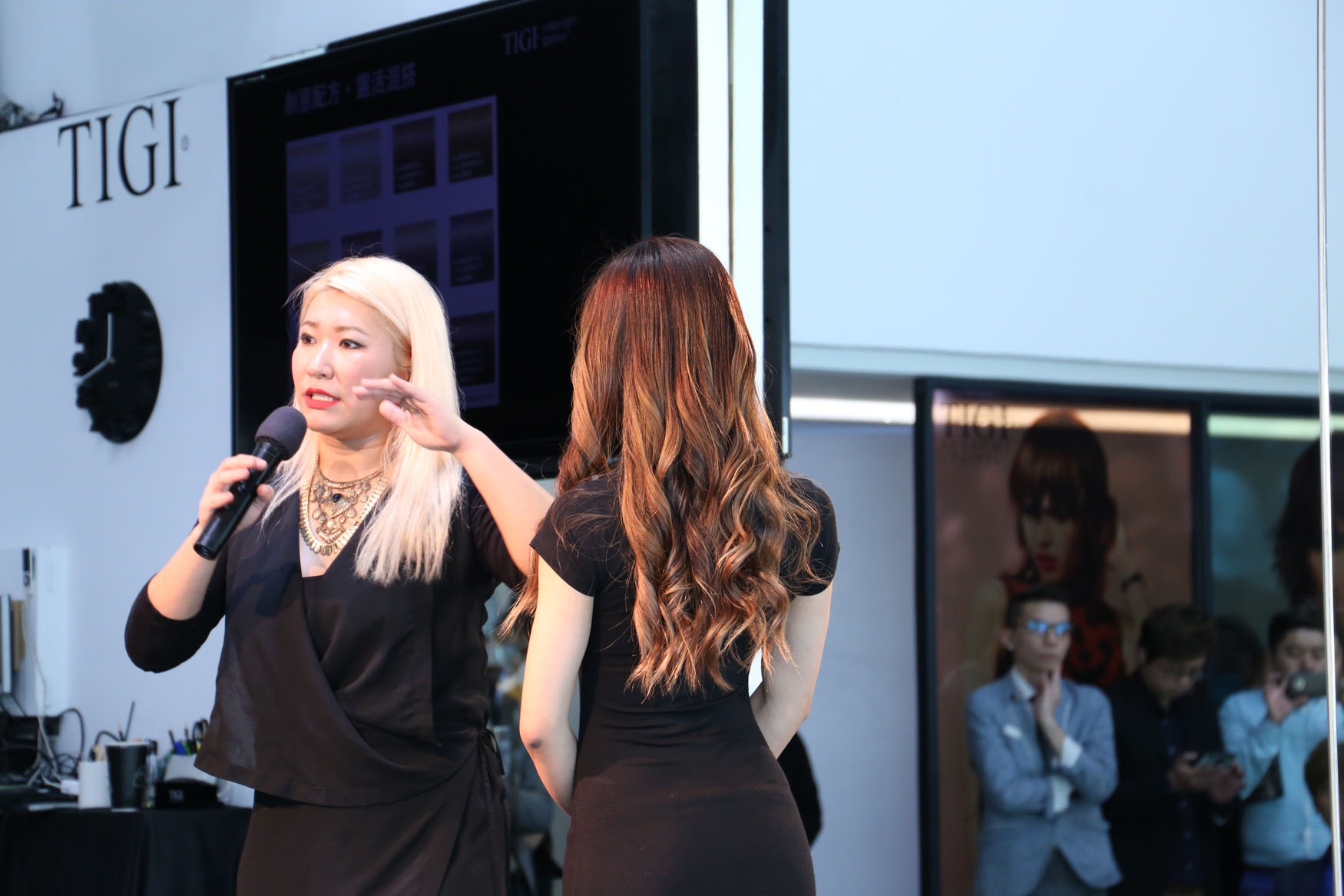 130幾位專業美髮師出席率踴躍座無虛席的現場,感受到髮色對於髮型設計是不容忽視的一環,尤其在季節交替時刻,髮色的改變能讓髮型如同換上新衣裳。一早八點不到,講師們緊鑼密鼓得忙著做前置準備,幫三位模特兒染髮、化妝、定裝…等