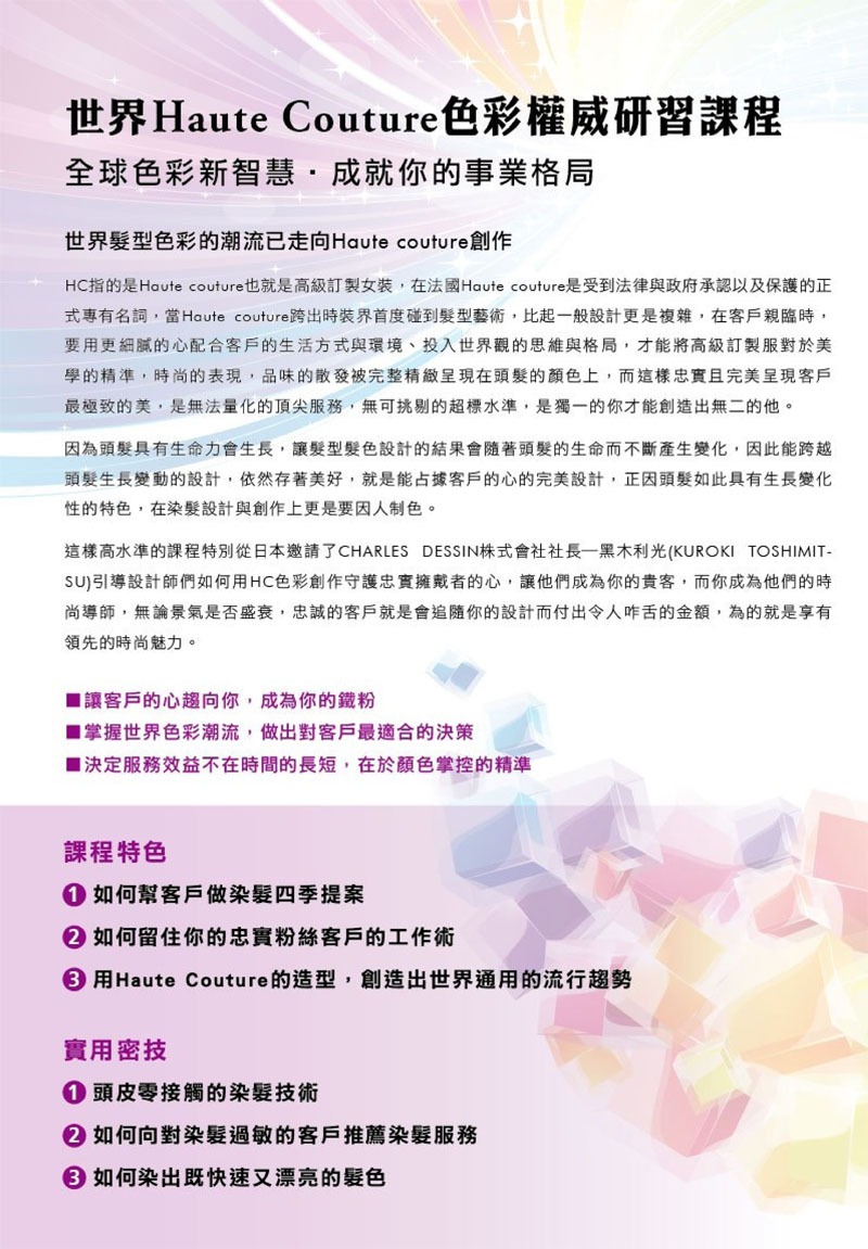 這樣高水準的課程特別從日本邀請了 CHARLES DESSIN 株式會社社長-黑木利光(KUROKI TOSHIMIT-SU)引導設計師們如何用HC色彩創作守護忠實擁戴者的心,讓他們成為你的貴客,而你成為他們的時尚導師,無論景氣是否盛衰,忠誠的客戶就是會追隨你的設計而付出令人咋舌的金額,為的就是享有領先的時尚魅力。