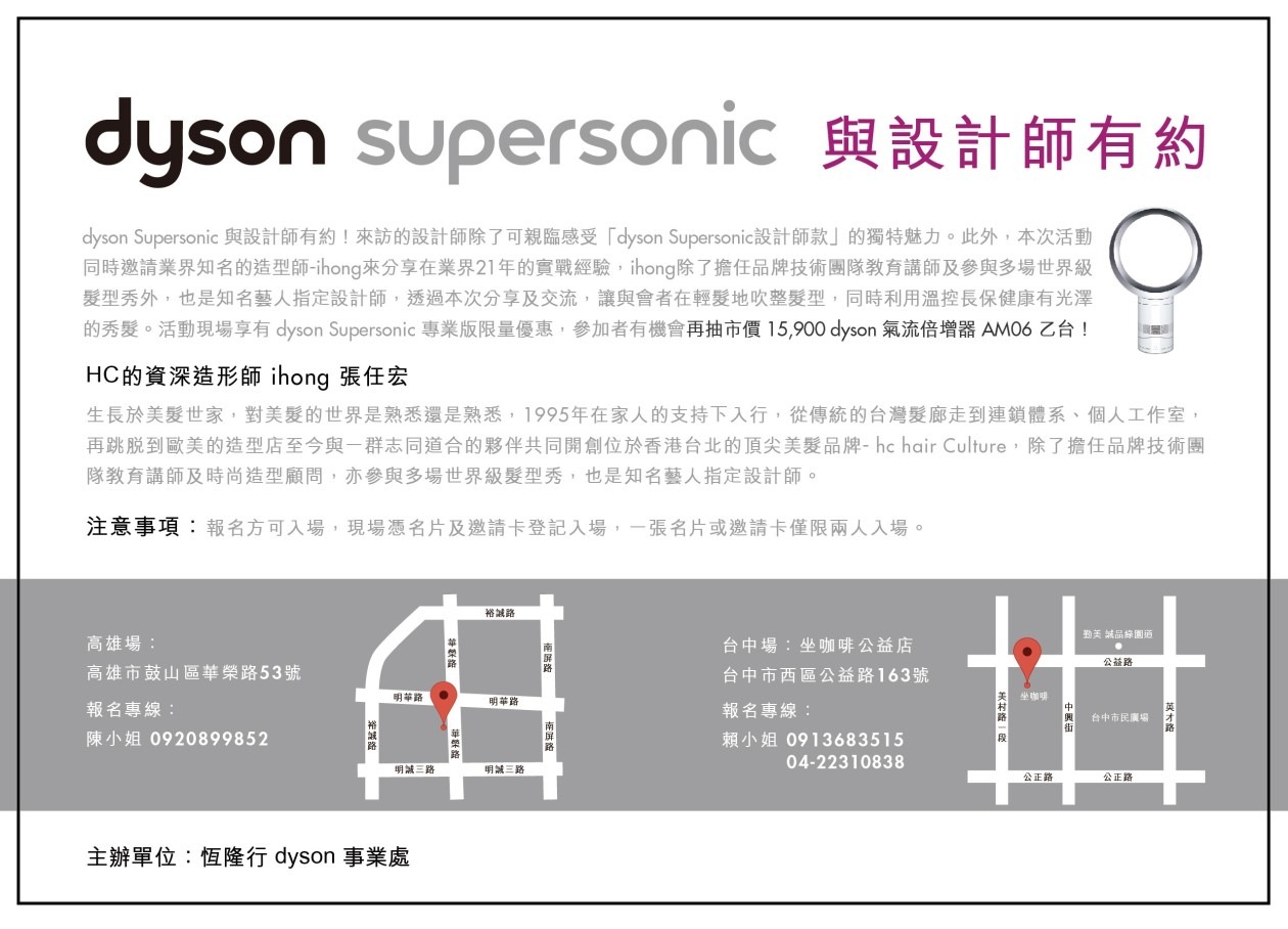 dyson Supersonic與設計師有約!來訪的設計師除了可親臨感受「dyson Supersonic設計師款」的獨特魅力。此外,本次活動同時邀請業界知名的造型師-ihong來分享在業界21年的實戰經驗,ihong除了擔任品牌技術團隊教育講師及參與多場世界級髮型秀外,也是知名藝人指定設計師,透過本次分享及交流,讓與會者在輕髮地吹整髮型,同時利用溫控長保健康有光澤的秀髮。活動現場除有驚喜活動之外,更享有優惠折扣。