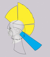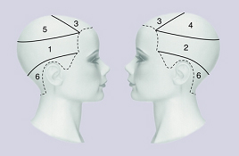 從頂點到兩側額角劃分出瀏海,將頭部的其餘部份使用兩條較淺的斜向後線條劃分為三個區位,這兩條線條分別是從太陽穴下方到枕骨之下,從額角到冠頂之下。上部區域在後部中間被再次垂直劃分,以便控制