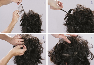 - 盤髮:為了使盤髮快速而光滑整潔,可先在隨意挑選出的分區中使用非氣霧劑型髮膠,然後將頭髮以盤旋式纏繞到非常窄的平板夾上。這樣我們就可以獲得直形紋理和曲形紋理的不規則組合