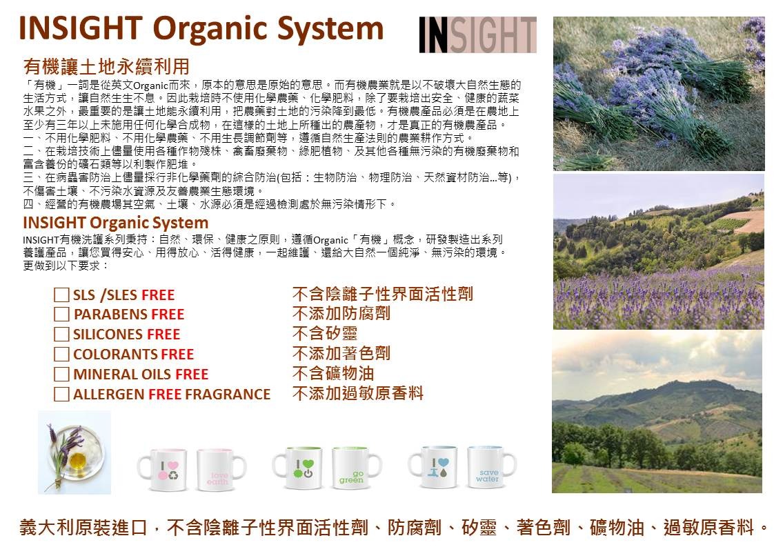 INSIGHT有機洗護系列秉持︰自然、環保、健康之原則,遵循Organic「有機」概念,